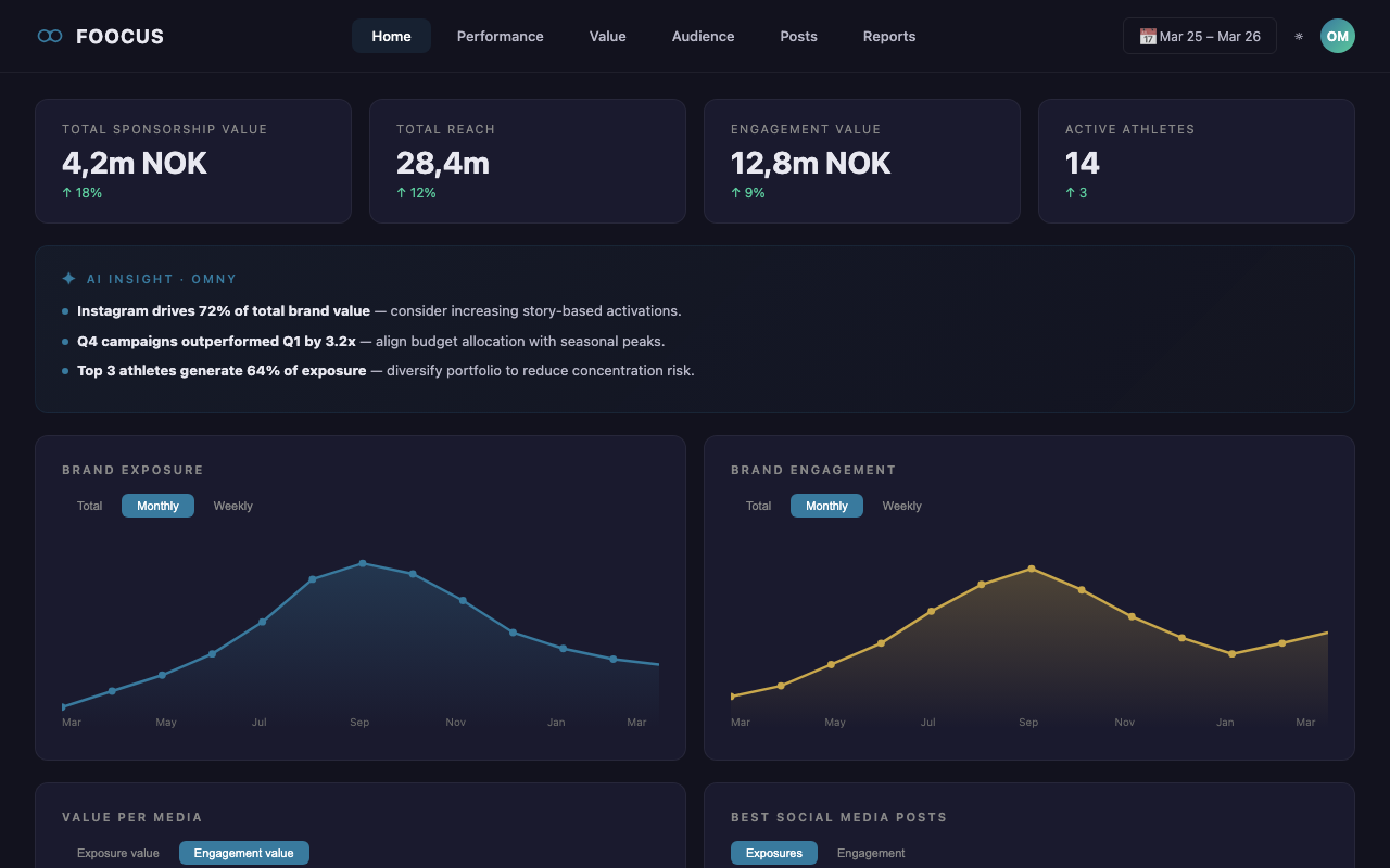 Foocus gives marketing teams and brand managers the intelligence to measure sponsorship ROI, justify investment to the board, and optimize every partnership in their portfolio.